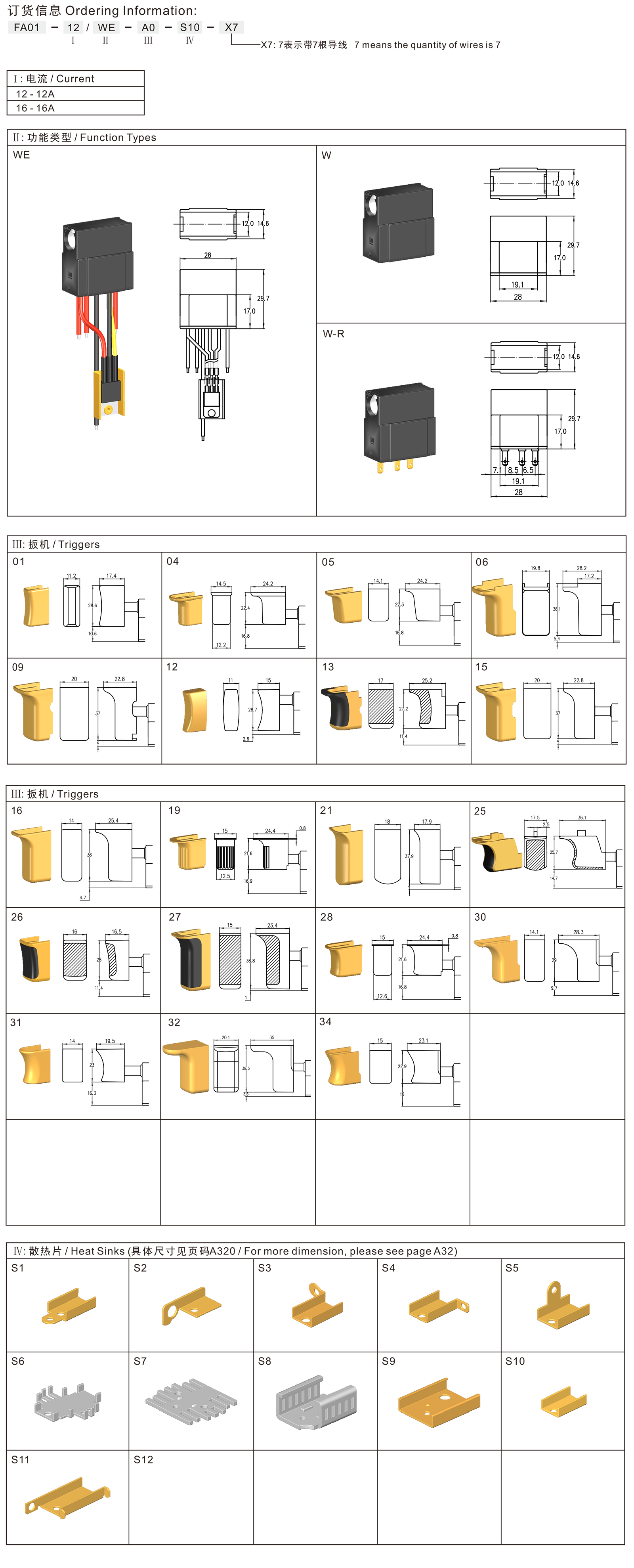 ◆FA01 series are one general type DC variable speed trigger switches, integrated dustproof and mechanical brake contact, optional with reversing box, for used in DC cordless portable power-tools such as: Cordless Drills, Cordless Screw Drivers, etc. Also special for used in DC medical tools, such as Cordless Bone Drills, Cordless Sternum Saws, Cordless Overhaul Saws, etc.