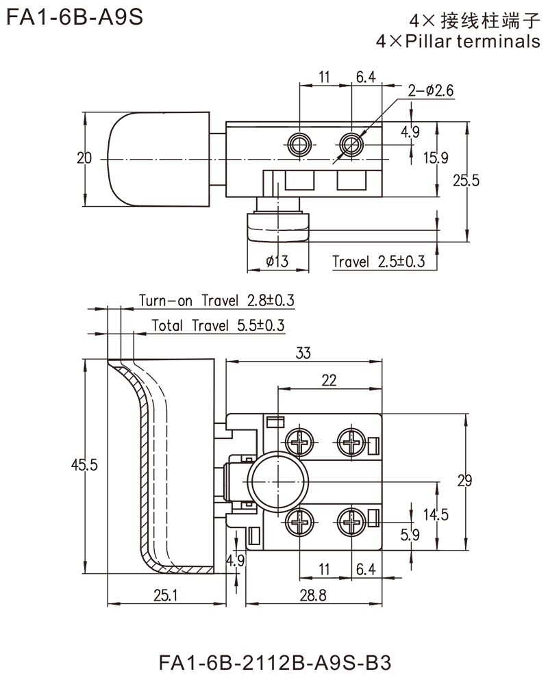 →2×接線柱端子 Pillar terminals φ=2.6mm or 2.8mm