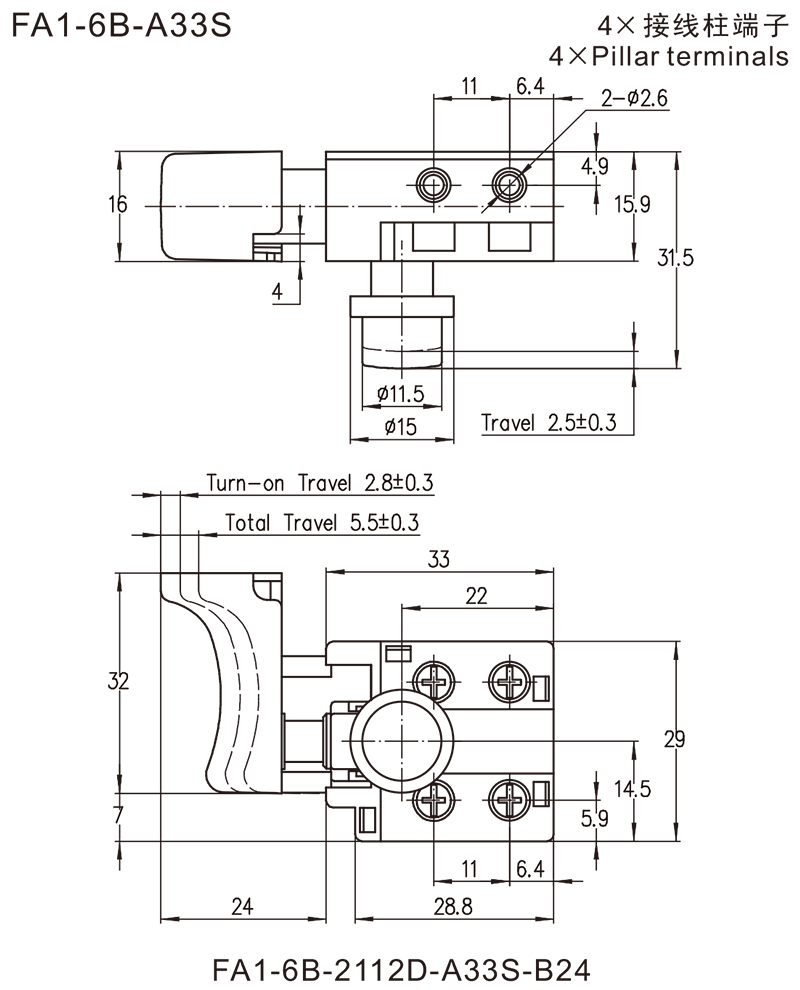 →2×接線柱端子 Pillar terminals φ=2.6mm or 2.8mm