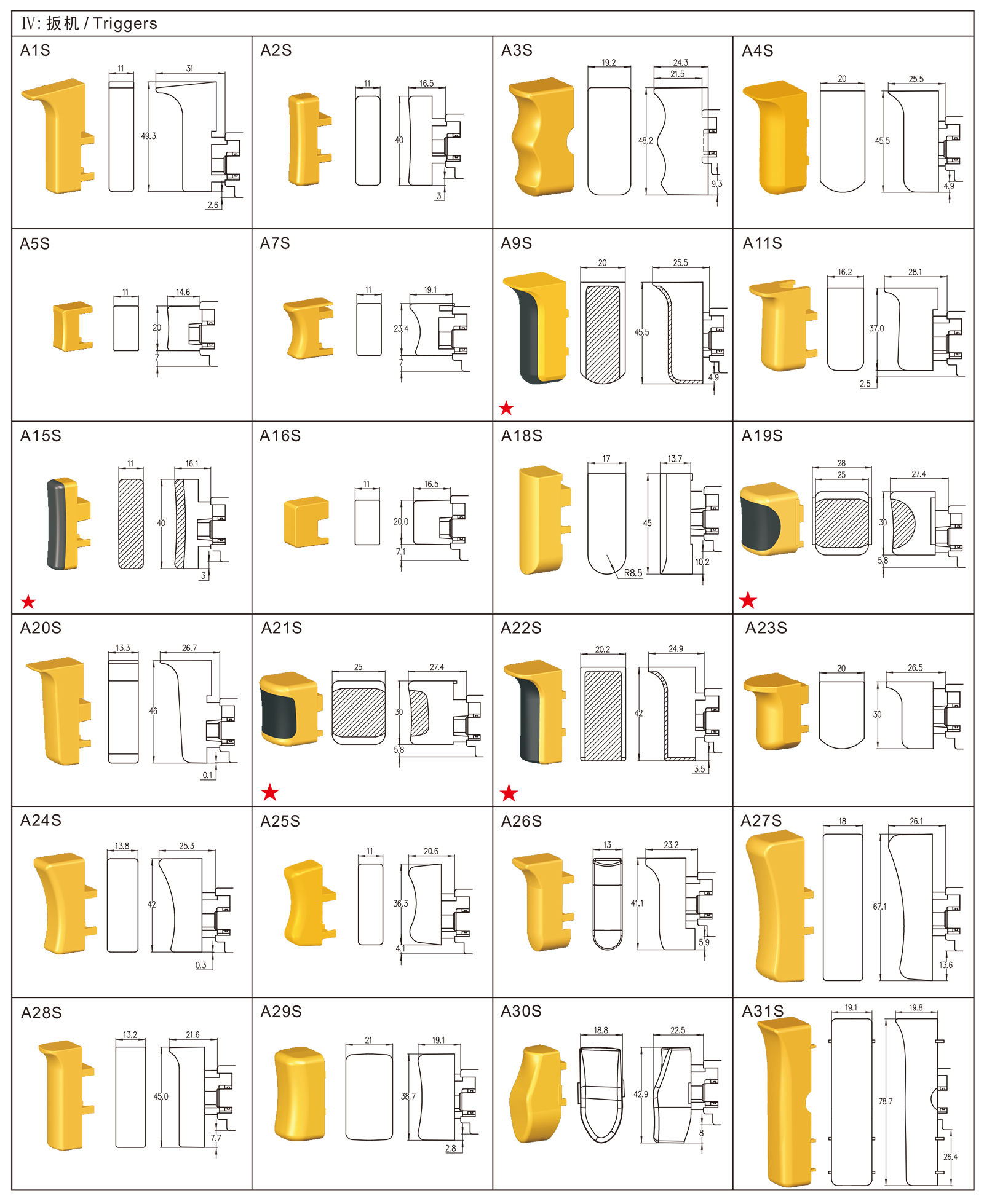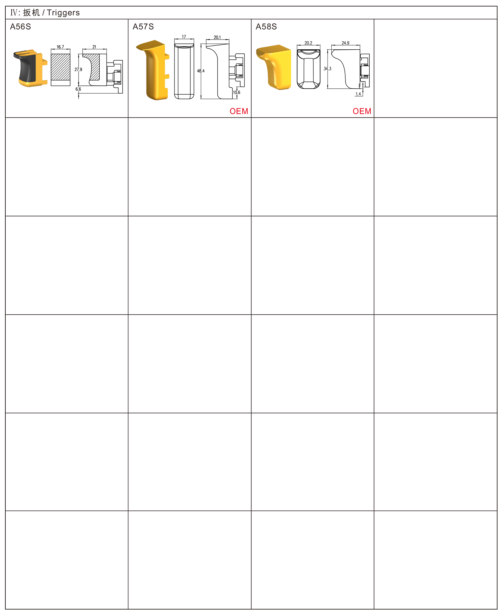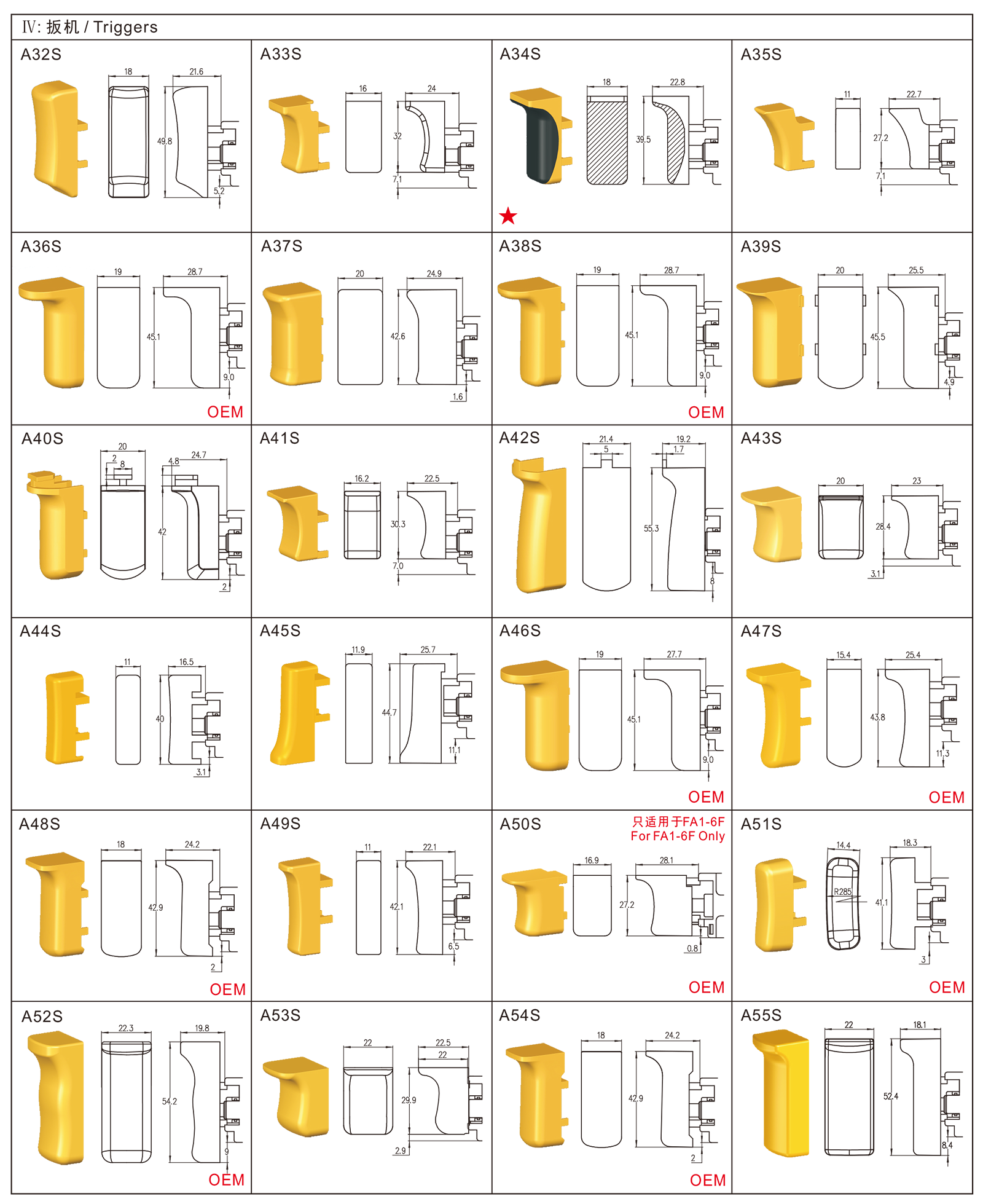 FA1-6B series are general type trigger switch, integrated dustproof, commonly for used in portable power tools such as Electric Drills, Rotary Hammers, Reciprocating Saws, Jig Saws, Electric Mixers, Cut-Off Machines, Marble Cutters, Electric Routers,  Circular Saws, Belt Sanders, Orbit Sanders, Polishers,Electric Planers, Electric Sprayers, Electric Nailers, etc. Besides, they are also suitable for power gardening tools, such as Grass Trimmers, Electric Chain Saws, Electric Lawnmowers, Electric Snowthrowers, etc.