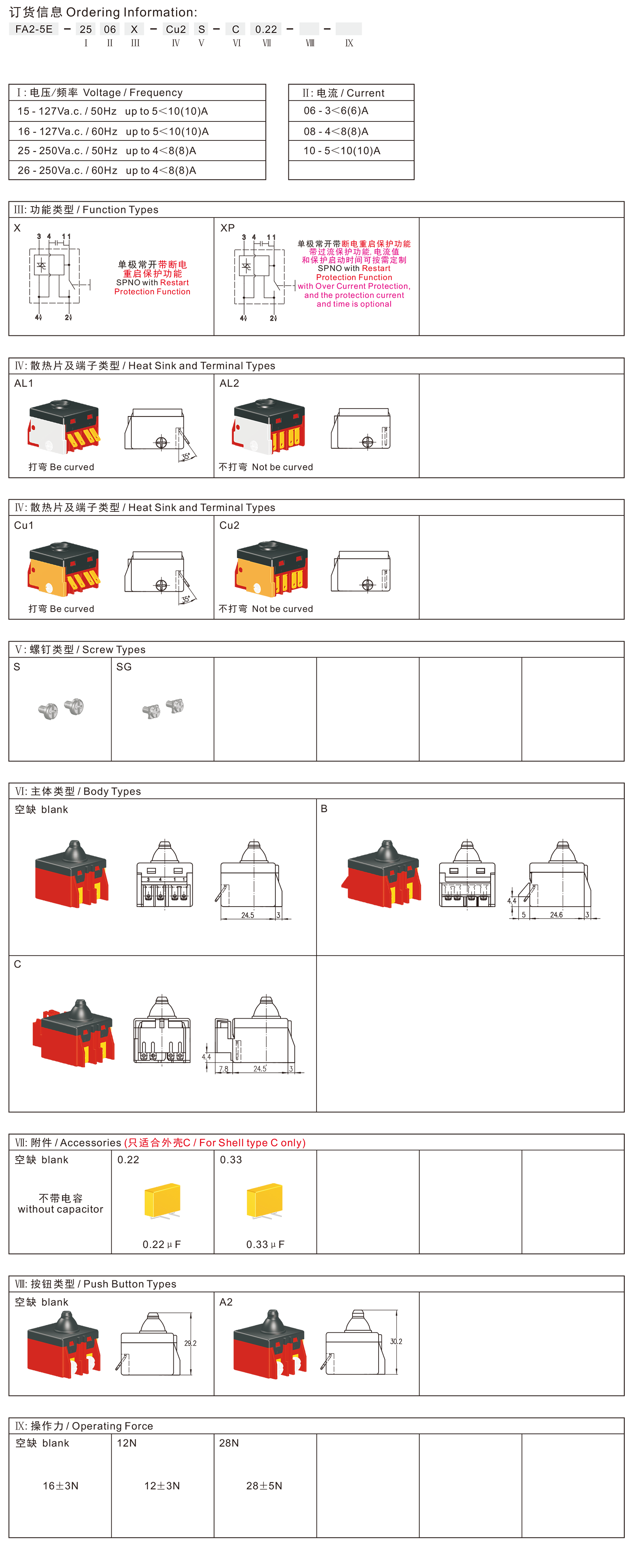 ◆FA2-5E series are special type push-button switch, integrated dustproof, keep the same size with existing FA2-5N series, with restart protection when the power supply is interrupted (Electronics Type), designed specially for small angle grinders according to EN60947, fulfill the new requirement for zero voltage protection (or NVR), commonly for used in portable power-tools such as 100mm and 125mm Angle Grinders, Polisher Grinders, Die Grinders, etc.