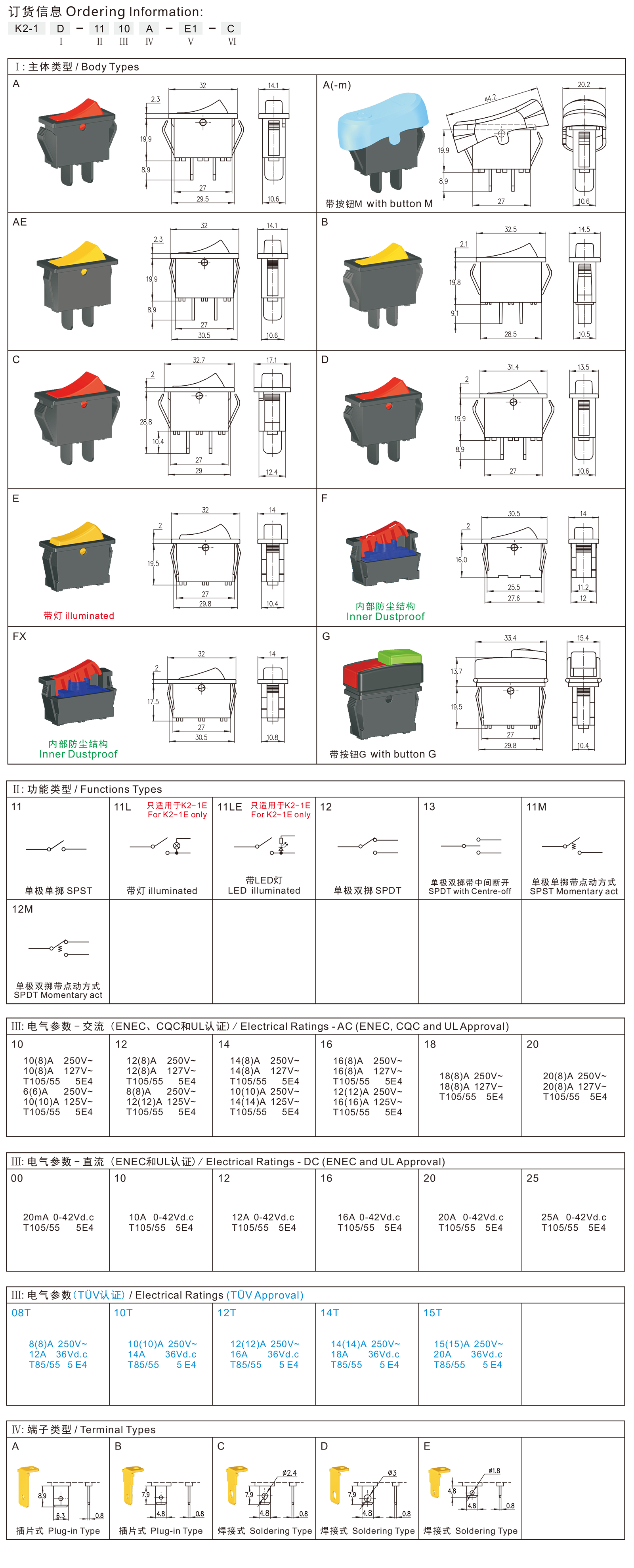 K2-1 series are one standard type rocker switch, optional with Protection Cap for dustproof and waterproof or inner dustproof structure, commonly for use in small Home appliances and office equipments, such as Heat Guns, Hair Driers, Electric Fans, Printers, Vacuum Cleaners, Dry and Wet Vacuum Cleaners, High Pressure Washers, etc.